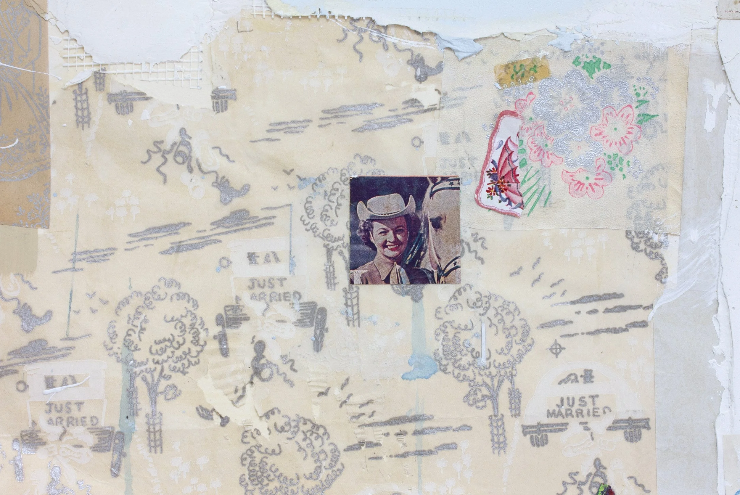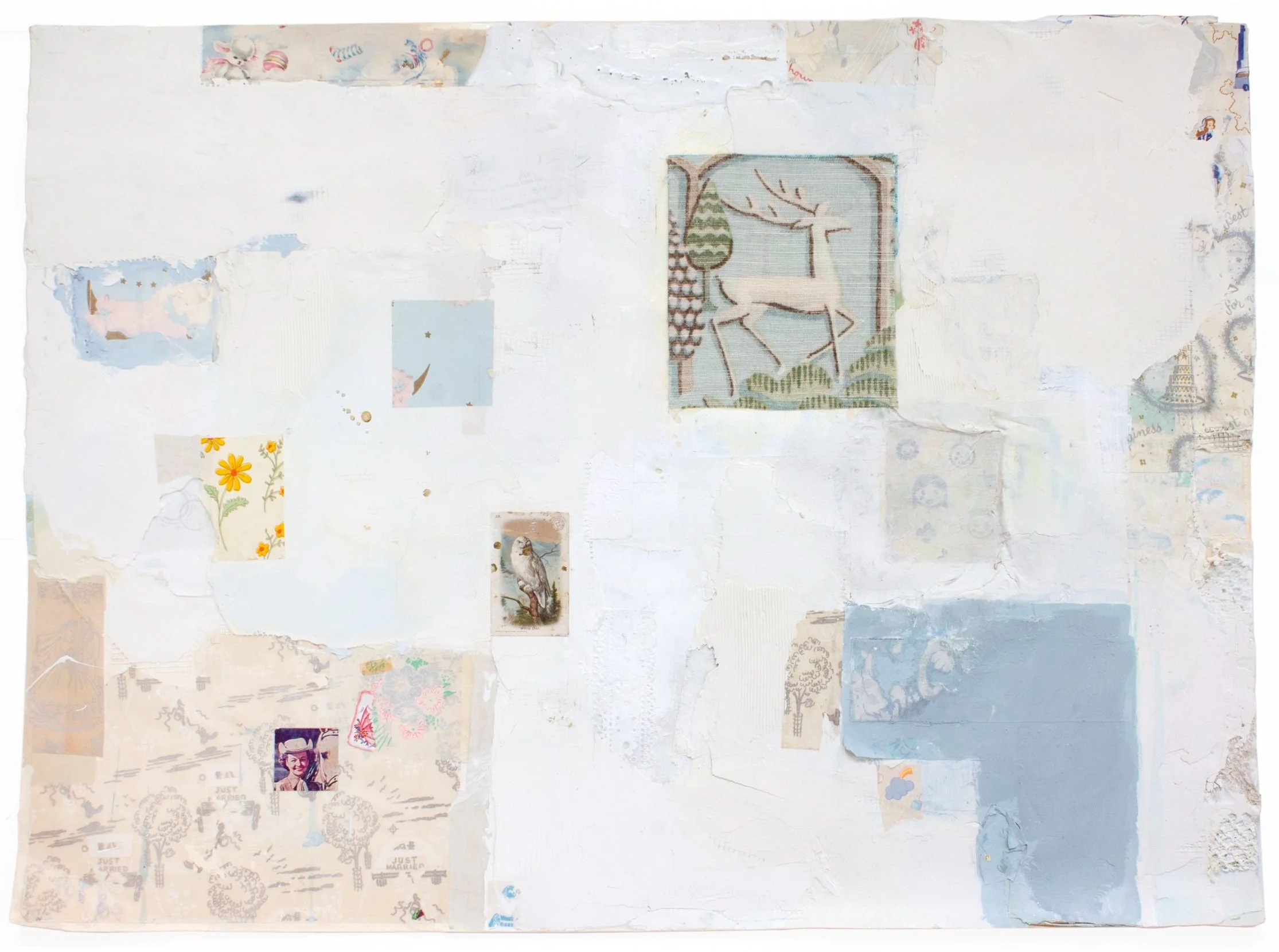 More about this work - Included is a card with a white owl and a clipping of Dale Evans from a Christian “track” that Roy Rogers and her made in the mid-1900s. The wrapping paper is from the same time period and all was collected by my grandmother. The upholstery fabric of a buck was given to me by my friend’s mother, Carol.